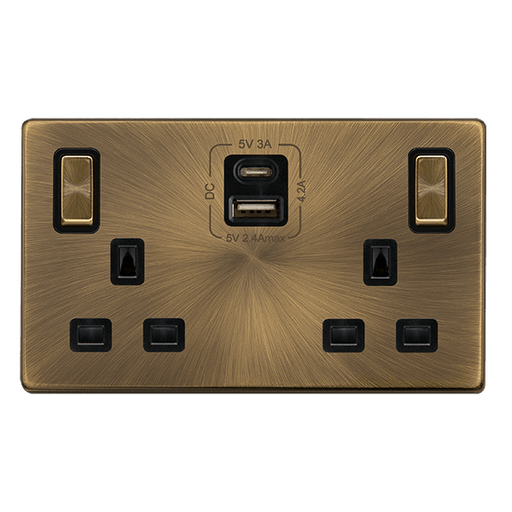 • Scolmore SFAB586BK 13A INGOT 2 GANG SWITCHED SAFETY SHUTTER SOCKET WITH TYPE A & C USB - ANTIQUE BRASS COVER PLATE - BLACK INSERT