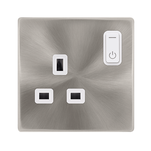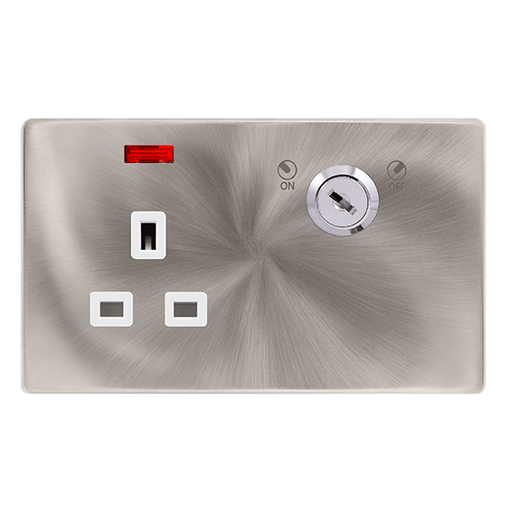 • Scolmore SFBS655PW 13A 1 GANG DOUBLE POLE KEY LOCKABLE SOCKET WITH NEON - BRUSHED STEEL COVER PLATE - POLAR WHITE INSERT