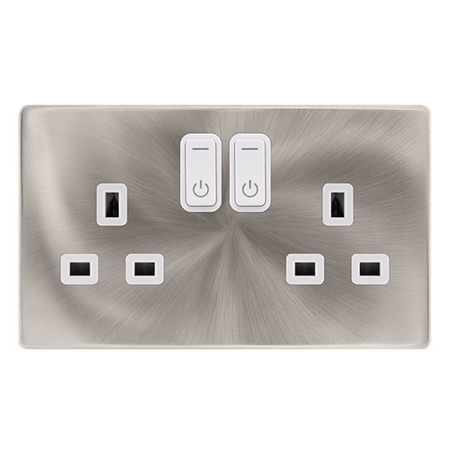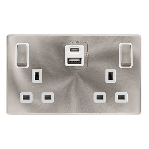• Scolmore SFBS586PW 13A INGOT 2 GANG SWITCHED SAFETY SHUTTER SOCKET WITH TYPE A & C USB - BRUSHED STEEL COVER PLATE - POLAR WHITE INSERT