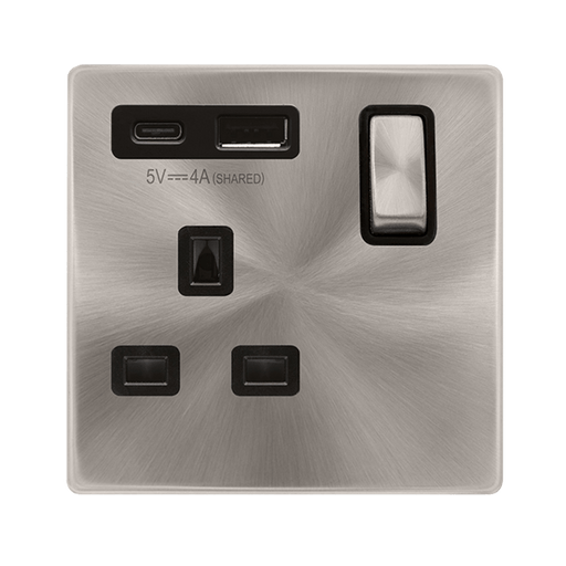 • Scolmore SFBS585BK DEFINITY 'INGOT' 13A 1 GANG SWITCHED SAFETY SHUTTER SOCKET OUTLET WITH TYPE A & C USB (4A) OUTLETS - BRUSHED STAINLESS - BLACK INSERTS