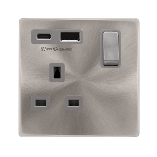 • Scolmore SFBS585GY DEFINITY 'INGOT' 13A 1 GANG SWITCHED SAFETY SHUTTER SOCKET OUTLET WITH TYPE A & C USB (4A) OUTLETS - BRUSHED STAINLESS - GREY INSERTS