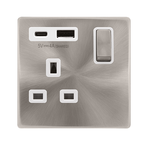 • Scolmore SFBS585PW DEFINITY 'INGOT' 13A 1 GANG SWITCHED SAFETY SHUTTER SOCKET OUTLET WITH TYPE A & C USB (4A) OUTLETS - BRUSHED STAINLESS - POLAR WHITE INSERTS
