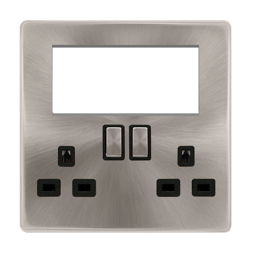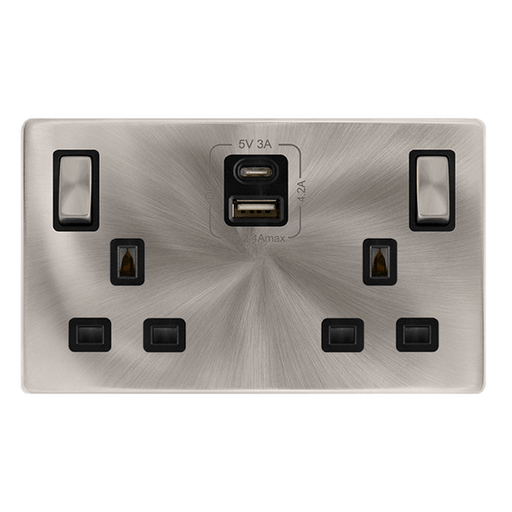• Scolmore SFBS586BK 13A INGOT 2 GANG SWITCHED SAFETY SHUTTER SOCKET WITH TYPE A & C USB - BRUSHED STEEL COVER PLATE - BLACK INSERT