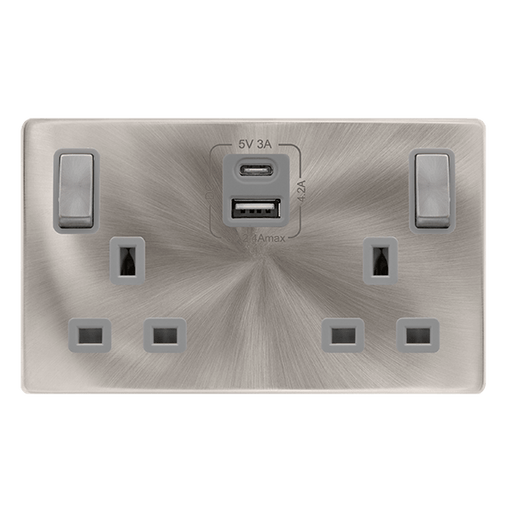 • Scolmore SFBS586GY 13A INGOT 2 GANG SWITCHED SAFETY SHUTTER SOCKET WITH TYPE A & C USB - BRUSHED STEEL COVER PLATE - GREY INSERT