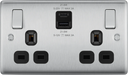 BG Nexus NBS22UAC22B Brushed Steel 13A 2 Gang Switched Socket + 22W USB - Black Inserts
