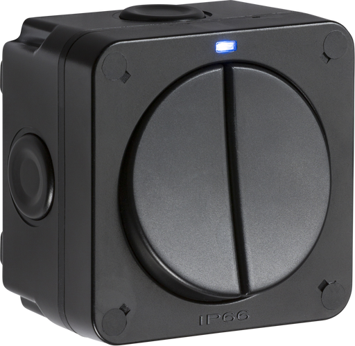 Outdoor switch with blue LED activity/location feature. Manufactured from robust, high impact grade polycarbonate for a long life Black finish wit...