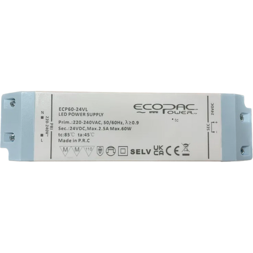 View full detailsECP60-VL Features: 60W Constant Voltage Driver Features:Low Profile Constant Voltage DriverAC input: 220-240VACBuilt in PFC Function, Flicker FreeE...