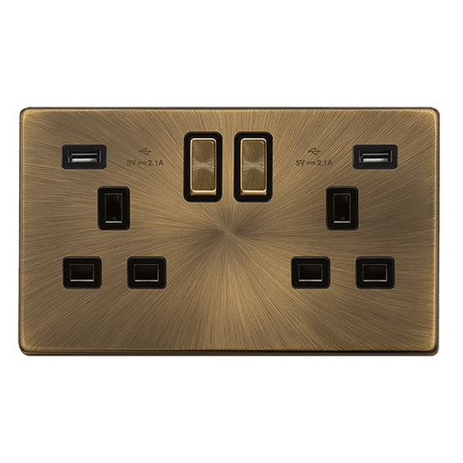 Scolmore SFAB580BK 13A INGOT 2 GANG SWITCHED SOCKET WITH 2.1A USB OUTLETS - ANTIQUE BRASS COVER PLATE - BLACK INSERT