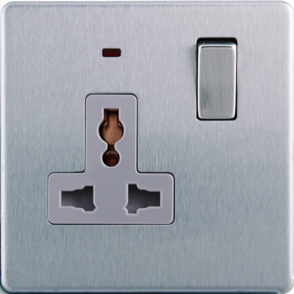 The BG Nexus Screwless Flat Plate FBS27LG is a switched single universal socket with a power indicator, finished in brushed steel. All the BG Screwless Flat plate sockets have an ultra slim profile with a screwless easy clip on/off front plate and have a lightly lacquered surface to help reduce fingerprint marks.