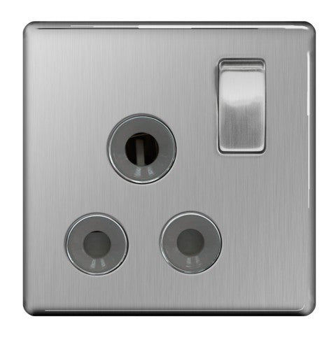 BG FBS99G Screwless Flat Plate Brushed Steel 15A 1 Gang Single Pole Switched Socket - Grey Insert
