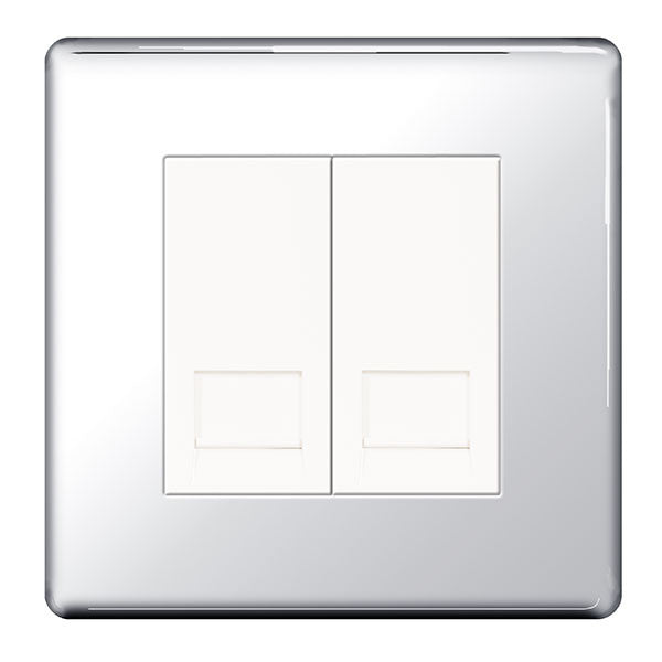 The BG Nexus Screwless Flat Plate FPCBTM2 is a 2 Gang telephone socket, finished in chrome. All the BG Screwless Flat plate sockets have an ultra slim profile with a screwless easy clip on/off front plate and have a lightly lacquered surface to help reduce fingerprint marks.