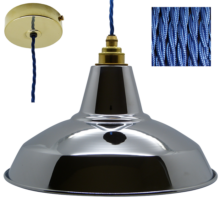 TIM Industrial Shade Pendant Set 1mtr. Chrome Shade, Brass Rose, Twisted Cobalt Blue Flex